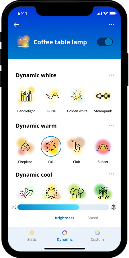 Make your own mix of different colour and white lights modes to create the perfect light ambience for your daily moment. Simply save your new Scene and select it anytime with the WiZ app or voice.