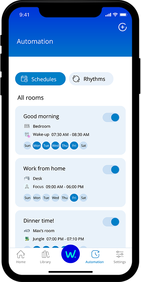 Automate your smart lights to follow your daily or weekly routines. Schedule your lights to turn on in the morning or before you arrive home, and to keep them off to save energy, when they are not necessary.